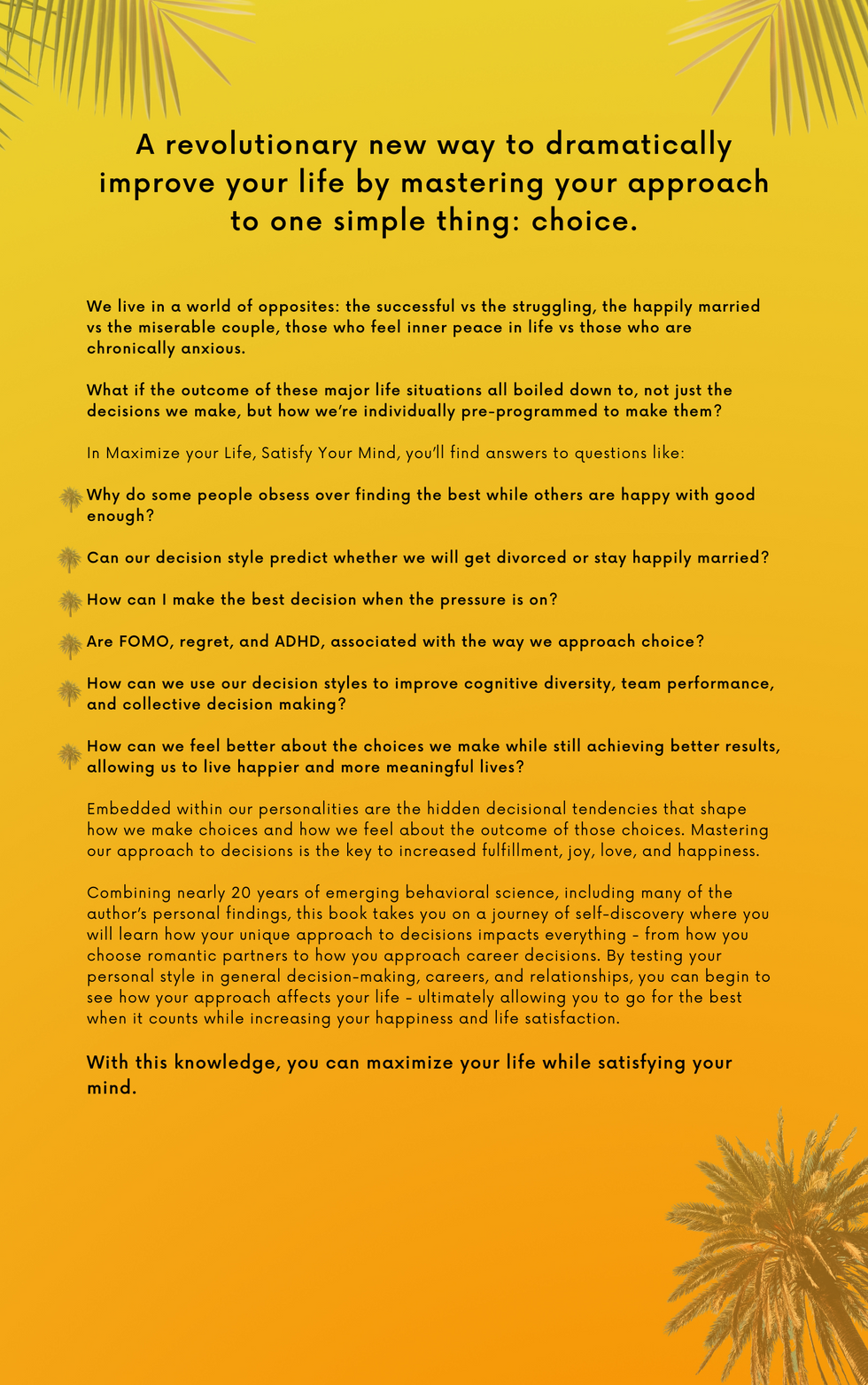 I designed the book cover, questionnaires to be featured within the book, and the accompanying landing page for "Maximize your Life, Satisfy your Mind," scheduled for publication in 2026. You can find the landing page at https://www.maximizeyourlifebook.com/.